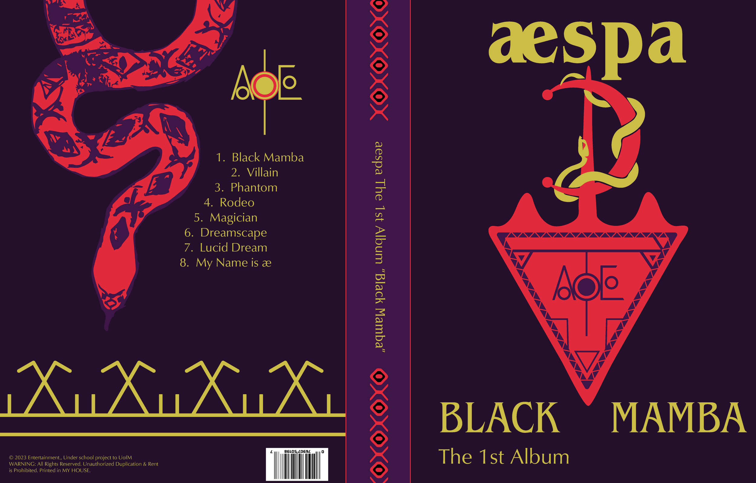 For this project, I wanted to apply my cultural heritage as a concept for a K-pop album release. The K-pop group used for this project is “aespa”. I turned their debut single “Black Mamba” into a full album. The single has a unique music video concept and song title that I was inspired to turn it into an album release. I designed a physical album, music platform cover, and digital inclusions of what the album would contain.